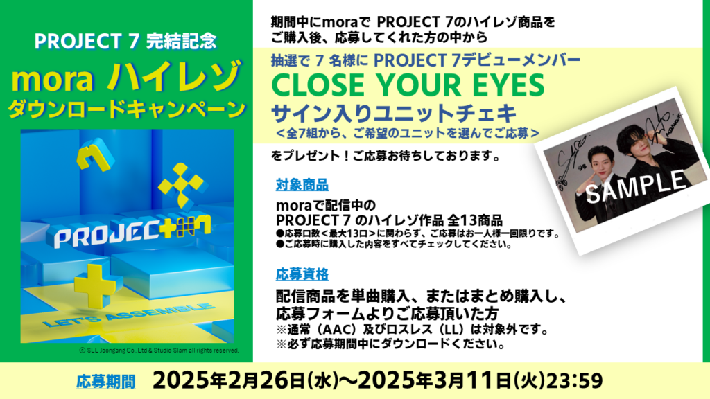 キャンペーンの対象となる楽曲は、「PROJECT 7」オーディションで使用された楽曲のうち、音楽配信中の全11曲。単曲購入の他、アルバム「ORIGINALS MATCH」「FINAL」でのまとめ購入でも応募できる。本キャンペーンは、moraで「PROJECT 7」のハイレゾ楽曲をご購入後、ご応募いただいた方の中から抽選で7名に「PROJECT 7 デビューメンバー’CLOSE YOUR EYES’サイン入りユニットチェキ」をプレゼントする、というもの。