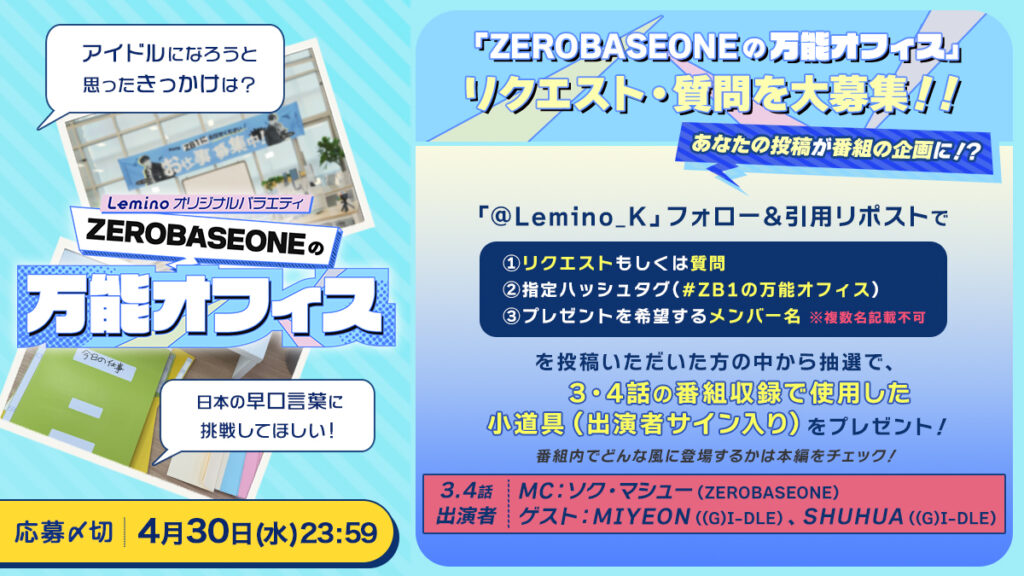 【Leminoオリジナル「ZEROBASEONEの万能オフィス」】第3話・第4話のMC&ゲスト情報を解禁!<MC> ZB1 ソク・マシュー×<ゲスト> (G)I-DLE MIYEON&SHUHUA! 本日よりMC&ゲストへのリクエスト・質問を大募集!