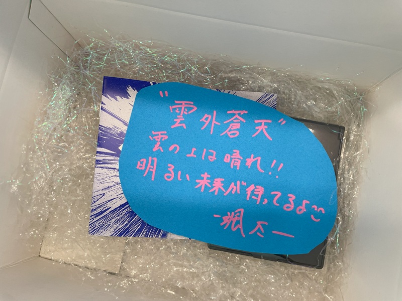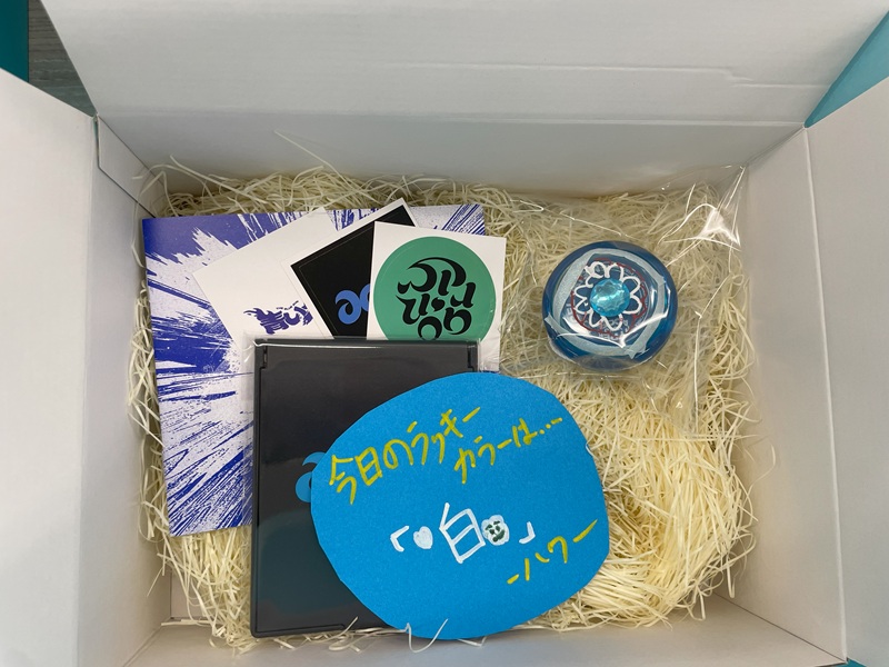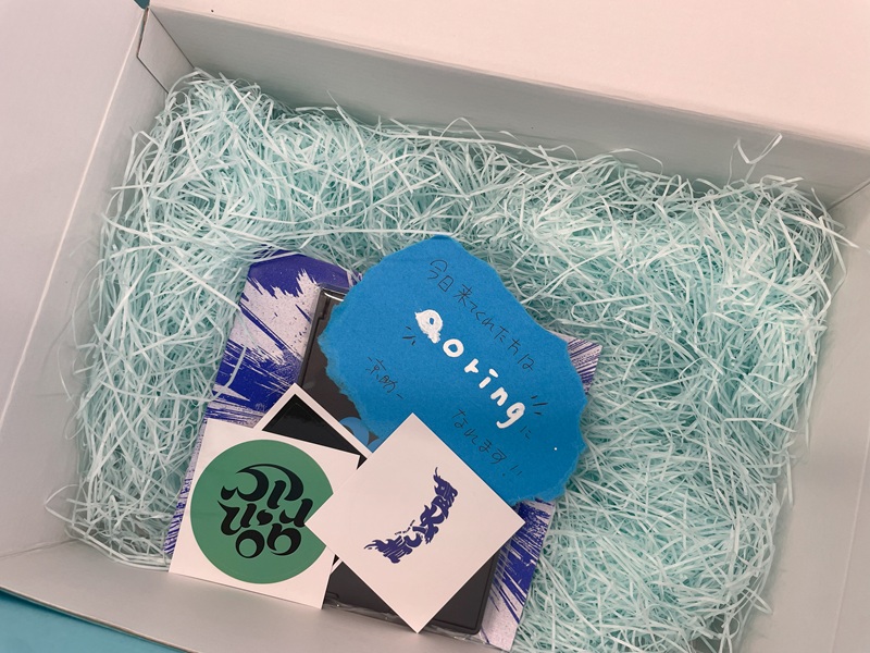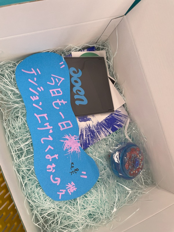 写真は 来客にプレゼントされたギフト。1つ1つにメンバー手書きのメッセージカードが入っていた。ギフトやカードは開けてのお楽しみ!1つ1つ異なっていた。