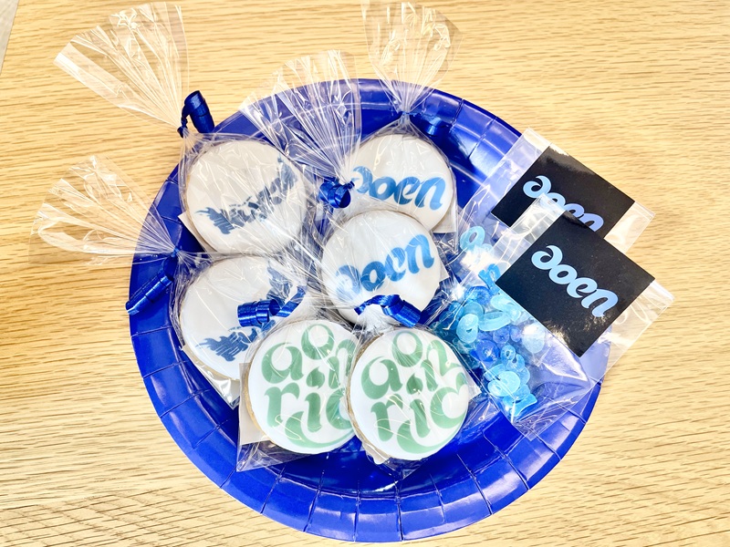 会場にはaoenの世界観を表現したブルーカラーのサンドイッチやおにぎり、ケーキ、他いろいろな軽食も準備され、来客に振る舞われた。 薄いブルーカラーのおにぎりに巻かれた海苔は、なんと「aoen」とくりぬかれている凝りよう!アイシングクッキーにはaoenのロゴや「青い太陽」の文字などがプリントされていた。ブルーカラーのドリンクも爽やかに喉を潤し、気分をリフレッシュしてくれた。
