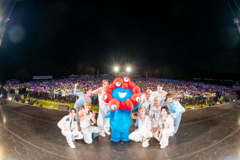 エンディングには、再びミャクミャクがステージへ。JO1メンバーと会場とともに記念撮影を行い、大盛況のうちに2日間のライブは終了しました。