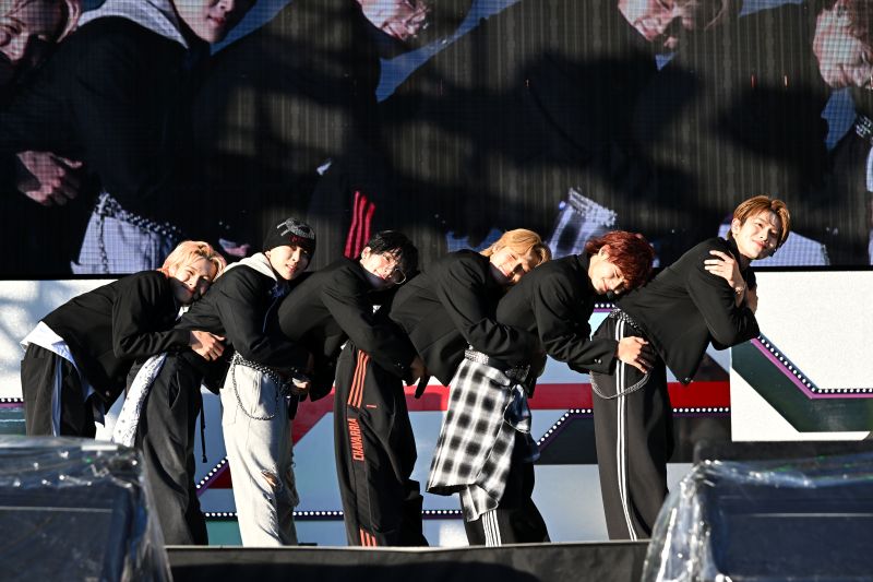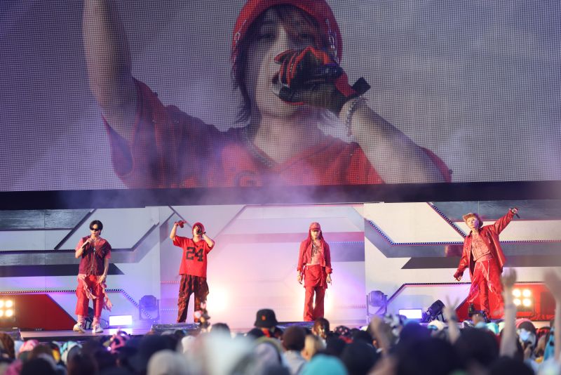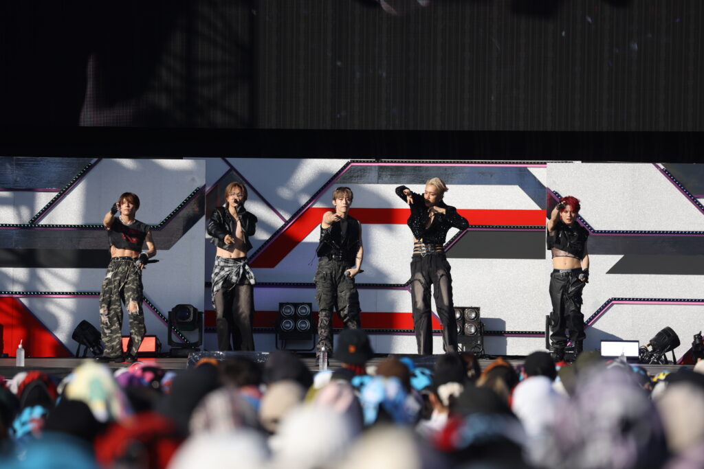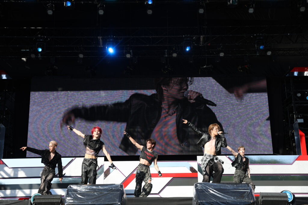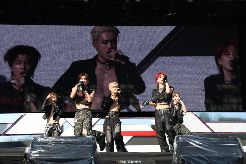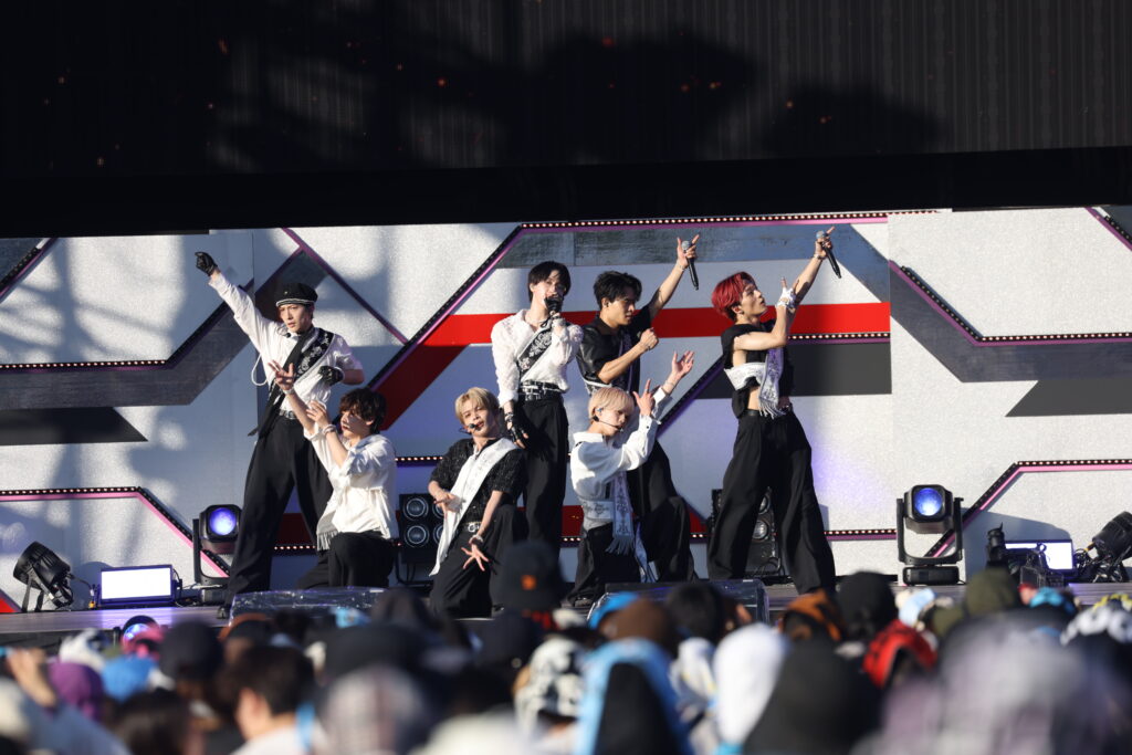 6人組のグローバルボーイズグループ、DXTEENは「Handle」からライブをスタート。黒の学ラン風衣装で1曲目から激しいダンスを見せると、キメの部分では会場から歓声が。「僕たちといっしょに遊びましょう!」と呼びかけ、今年5月にリリースされた「Tick-Tack」へ。ミディアムテンポのかわいさを感じさせるラブソングは、真夏のステージに爽やさを感じさせてくれます。そして「この曲で盛り上がっていきましょう!」とINIの「BAD BOYZ」をサプライズカバー。以前からメンバーがやってみたいと話していた曲だけに、イントロが流れた瞬間に会場は大盛りあがり。さらにJO1の「OH-EH-OH」カバーへと続き、会場はヒートアップしていきます。原曲へのリスペクトを込めたジャケットを使ったパフォーマンスには悲鳴にも似た歓声が。