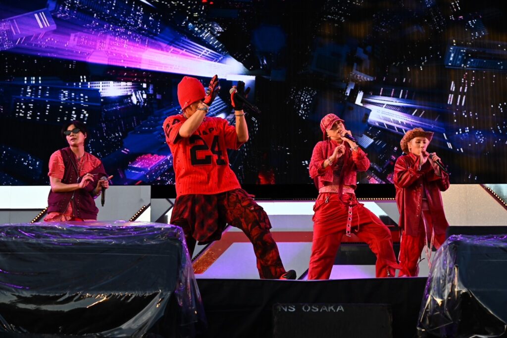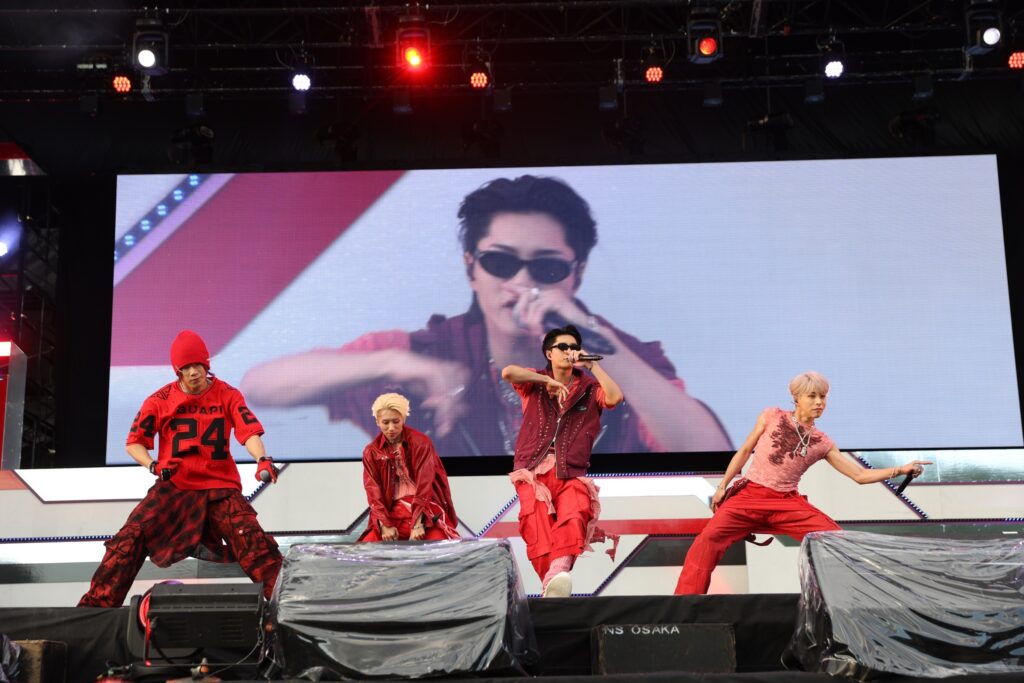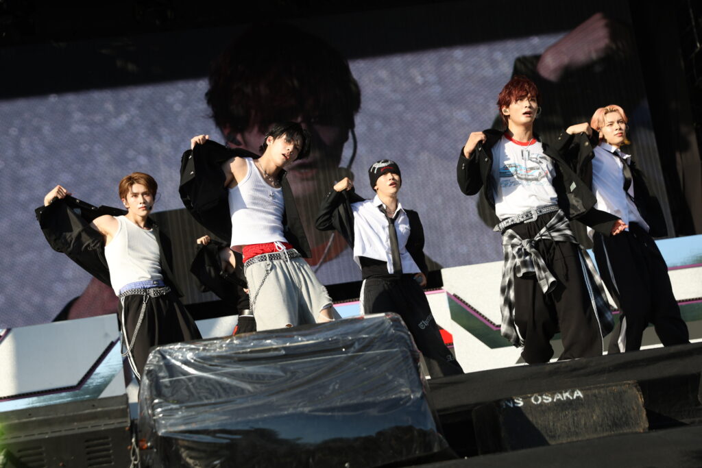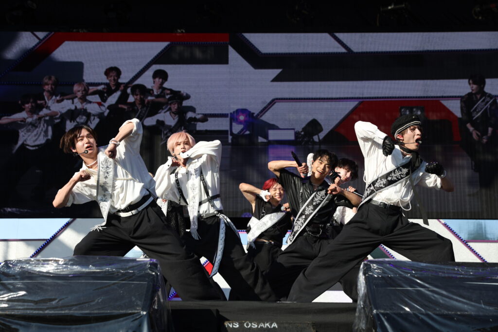 自己紹介では浦野秀太が「伝説の浦野秀太です!」と笑わせると、佐野文哉も「アイドル最速、佐野文哉です! 俺に着いてこれるやついんのか!」と盛り上げ。浦野は「みんなの声、もっと聞かせて?」と呼びかけると、会場を「バン」と「パク」の半分に分けて声出し合戦を始めます。予想以上に大きな声が揃ったのを聴いた浦野は「昔やってた?」とひとボケ。そして、次の曲が「SORENA」であることを伝えると、「今日熱いよね!」「SORENA!」とコール&レスポンス。しかし続いての「このあとのJO1、楽しみだよね!」「SORENA!」では、「(声)デッカ!」とメンバー全員ががっくりした様子を見せて、笑わせました。曲が始まると、「もっとイケるぞ!」と会場を煽り、サビでも会場全体が声を合わせて「SORENA!」と大盛り上がり。しかし、「まだまだ声出していけるよな!」とさらに煽ってヒートアップさせていきます。続く「LOVEBANDITZ」でも「万博、最高の夏にしよう!」としっかり煽り、会場からも負けじと声援が上がります。中川勝就は「必ずまたどこかで会いましょう」、浦野は「これからもどんどん大きくなっていくので、目を離さず見守ってくれたらうれしいです」、佐野は「盛り上がってくれてありがとうございました、泥だらけじゃないと出せないかっこよさがあると思うので、これからもよろしくお願いします」と続けます。そして本田は、これまでの道のりを振り返り、自分たちの音楽やパフォーマンスをもっと届けたい、その気持ちはこのライブに出演した他のアーティストたちも同じ、と熱い想いを話します。さらに先駆者であるJO1へ感謝を伝え、超えていきたい存在だとアピール。今回のイベントで、自分たちも含めた他のアーティストのことが少しでもいいと思ったら、ライブに足を運んでほしいと伝えました。そして「負けたとか負けてねぇとか自分で決めんなよ!」と叫んでから、最後の曲「Gamer」へ。夏の熱さに負けない熱い気持ちのこもったステージを届けました。