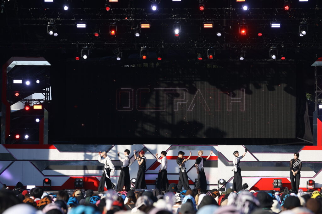 続いてステージに登場したのはOCTPATH。「行くぞ! 大阪!」の掛け声から1曲目の「WAKE UP」がスタート。詰めかけたTHme(ファンネーム)たちからは、早くも「ヤバい! ヤバい!」の声が上がるほど会場は熱気に包まれますが、それに応えるべく白と黒のコントラストが効いた衣装で躍動するメンバーたち。曲のタイトルどおり、会場の目を覚まさせるパフォーマンスをいきなり見せつけます。