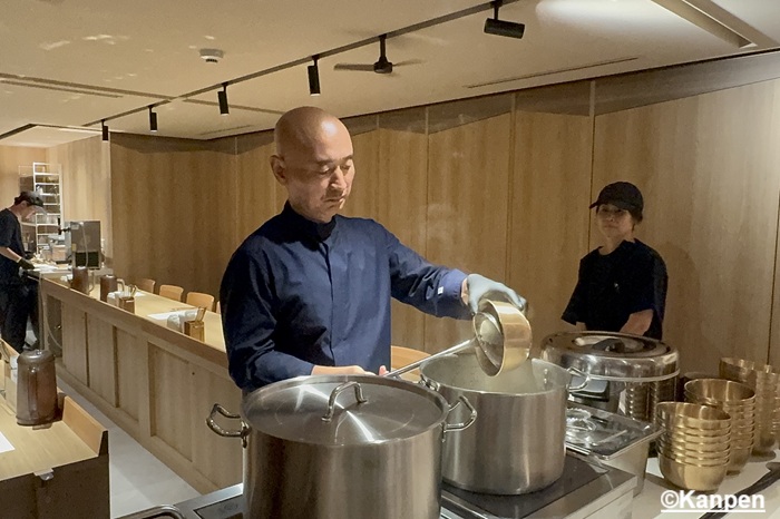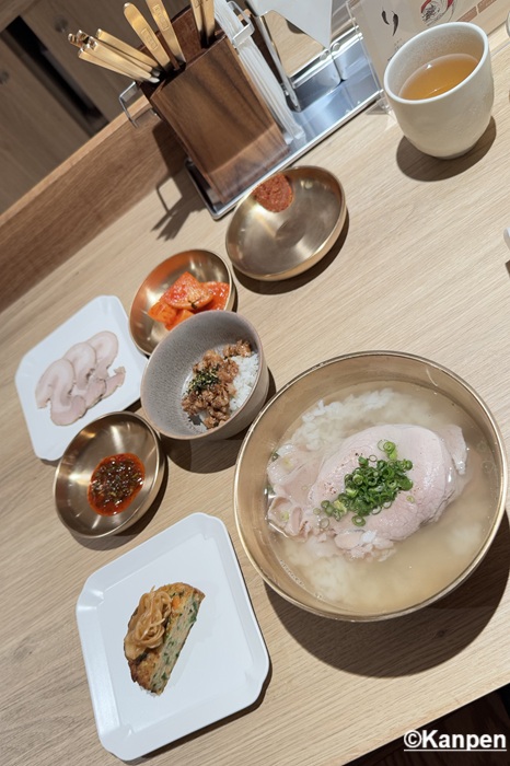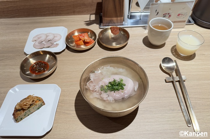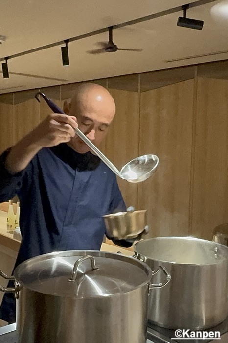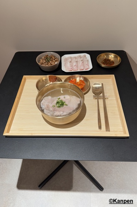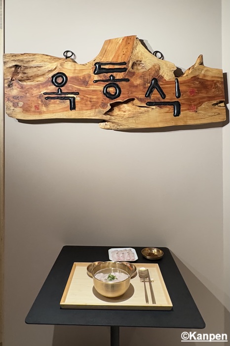 提供する直前に75℃~80℃に保たれた<昆布と塩だけでとっただし汁>をごはんの上に何度も注ぎ、温める。カウンター席の端に設置された調理台でシェフが何度も何度も繰り返す姿に、料理への愛情を強く感じる。 この韓国の伝統的な調理法(トリョム)によってご飯がスープを吸収しやすくなり、旨味と食感がぐっと増す。 そこに透明なスープが注がれ、その上に薄くスライスされたとても柔らかいウデ肉と、ネギが乗せられて提供される。