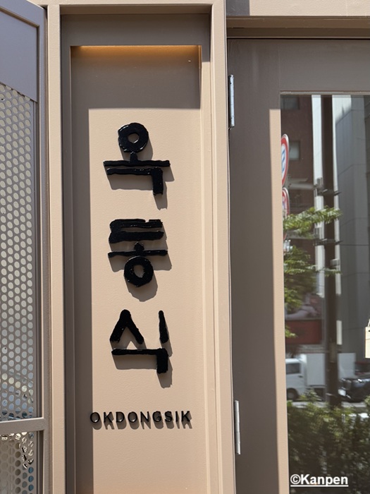 明治通りに面したわかりやすい立地。ガラスの扉を開け階段をおりると目の前に「옥동식(オクドンシク)」と大きな木材にハングルで書かれた表札。 店内はカウンター席が左右に一列ずつ広がっている。テーブル席は無い。 店内には華美な装飾は一切なく、いたってシンプル。 オクドンシクの料理に対する考え方と合致している。 清潔でシンプルな店内はとても落ち着く。 カウンター席のみなのでおひとり様でも気兼ねなく行くことができる。 お店の方も「おひとり様も大歓迎です」と語っていた。 いつ行っても落ち着いた店内で心を込めて作られたお料理をじっくり堪能できる。