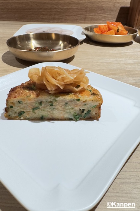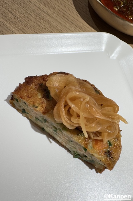 細かく刻んだエビと、ニラやネギなどの野菜を使ったチヂミ(かき揚げ)。 豚の脂でカリっと揚げてあるが、しつこさは一切無い。上に乗っている酢醤油に漬けた玉ねぎと一緒に食べると、脂で揚げてあるのにすっきりとした味わい。