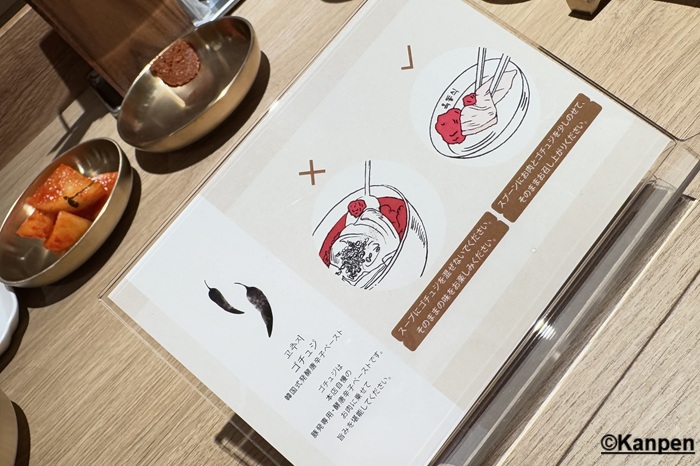「デジコムタン」を別の味わいでも楽しんでほしいと、韓国式発酵唐辛子ペースト(ゴチュジ)が別皿で添えられて出てくるので、お好みで使って味変で楽しむのも楽しい! その際は、ゴチュジをスープに入れてグルグルかき混ぜてしまうのはNG! スプーンに乗せたお肉の上に少しゴチュジを乗せて食べて欲しいそうだ。(尚、 オクドンシクのゴチュジは韓国本店自慢の豚専用・発酵唐辛子ペーストとなっている)