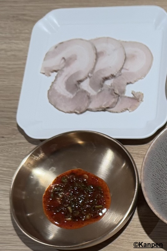 柔らかな豚ウデ肉をじっくりと煮込み、冷やしたもの。 「デジコムタン」に乗っているウデ肉より少し厚めにスライスさているがこちらもとてもやわらかい。 醤油・ごま油・小口ネギで和えたソースを絡めて食べる。 ウデ肉の食感や味をしっかりと味わえる、満足度の高い一品。
