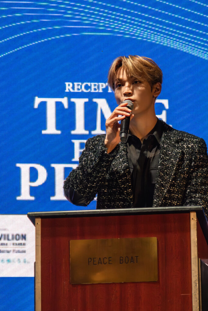 中満泉氏(国連事務次長‧軍縮担当上級代表)による講演や、二村英仁氏(ヴァイオリニスト、UNESCO Artist for Peace)によるヴァイオリン演奏の後、JO1リーダーの與那城奨が英語でスピーチ。