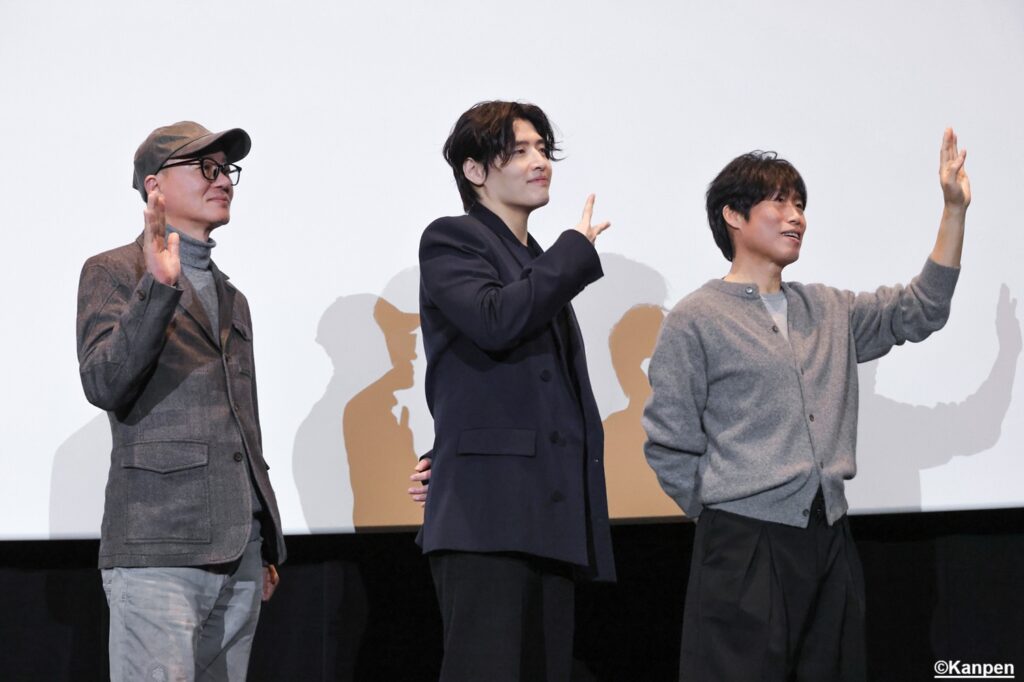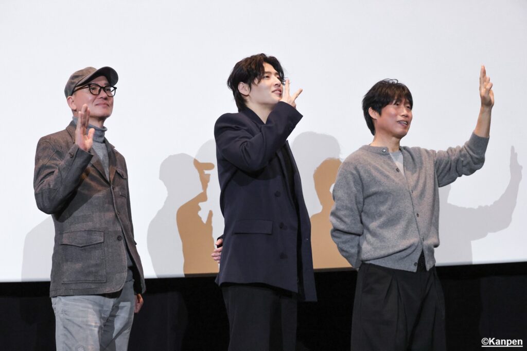 映画の上映が終わって間もなく、カン・ハヌル、ユ・ヘジン、ファン・ビョングク監督の3名が舞台横の上手扉から登場した。通常ならばそのまま舞台上へ歩みを進めるが、今回はいきなり客席内の階段を上りはじめ、中通路、そして反対側の階段を下りてから舞台へ。 予期せぬ客席内の練り歩きに、来場者たちの大歓声が会場いっぱいに響き渡った。一気に会場のボルテージが上昇!興奮状態のファンたちを見まわし、とても嬉しそうな3名。 カン・ハヌルもユ・ヘジンも日本で公開された出演作品は数多くあるが、公開に合わせての舞台挨拶での来日は二人とも初!カン・ハヌル、ユ・ヘジンにとって、そしてファンにとってもとても貴重なイベントとなった。