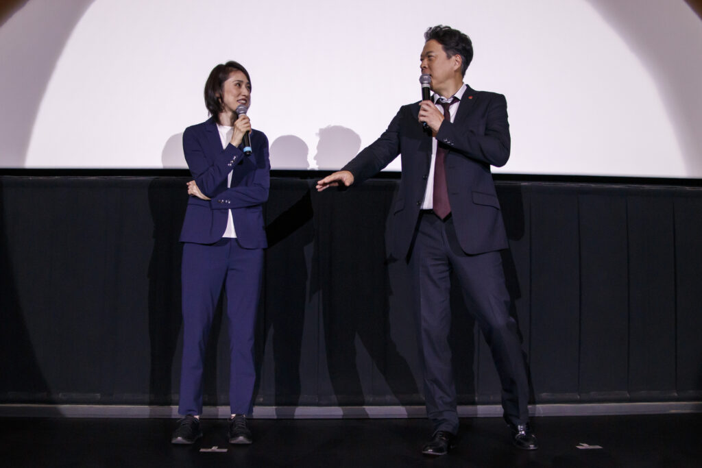 1月8日(木)に名古屋のミッドランドスクエアシネマで行われた舞台挨拶には、主演の天海祐希と田中哲司が登壇しました。上映後に二人が登場すると会場からは大きな拍手と歓声が沸き起こり、名古屋の印象について天海は「味噌カツや味噌煮込みうどんも好きですし、今日は大好きな鬼まんじゅうを食べてきました。芋けんぴも大好きで「頼むから買ってきてくれ」とお願いするぐらい名古屋は食べ物が美味しいです。あと、名古屋の街灯は暖色が多くて、ホテルから見る街灯の暖色が印象に残ってます。」と語り、三重県鈴鹿市出身で名古屋に思い出が多いという田中は「栄に「カーニバル」というディスコがありまして、そこに行くのがもう楽しみで入り浸っていました。当時のディスコミュージック『君の瞳に恋してる』で無理やり踊っていました、センスないのに(笑)。」と明かし会場を沸かせました。