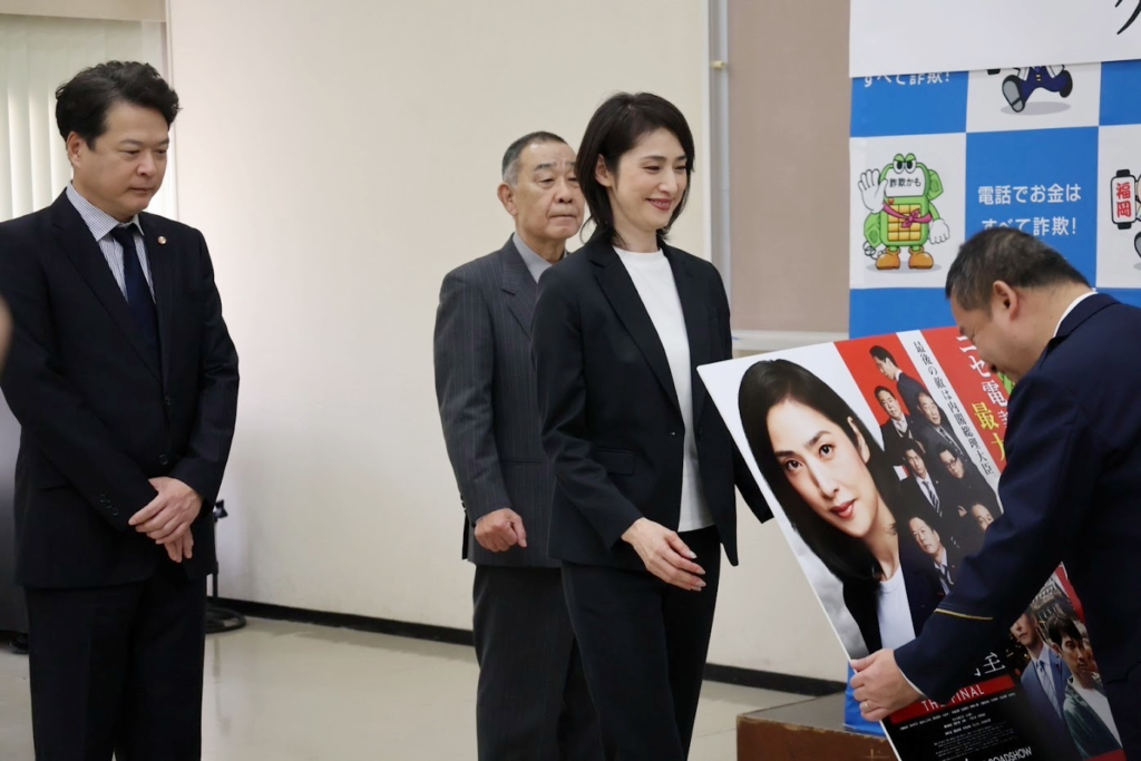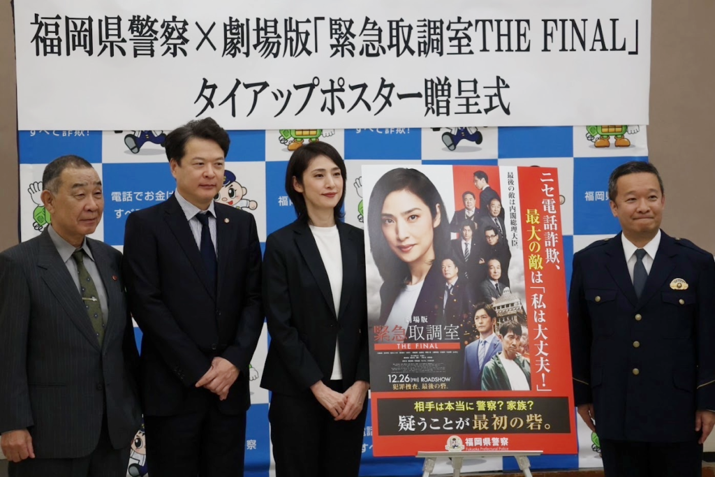 さらに翌日1月13日(火)には、福岡県警察にて劇場版「緊急取調室 THE FINAL」とのタイアップポスターの贈呈式が行われ、天海祐希、田中哲司、でんでんが福岡県警を表敬訪問しました。天海は今回のタイアップについて「人を信じることは凄く大切なことですが、信じるに値しない人もいて、そこをはき違えずに自分で見抜く力、おかしいなと思ったらそこに突き進んではいけないという事を一人一人が注意しなければいけないなと思います。」と語り、タイアップポスターを贈呈しました。