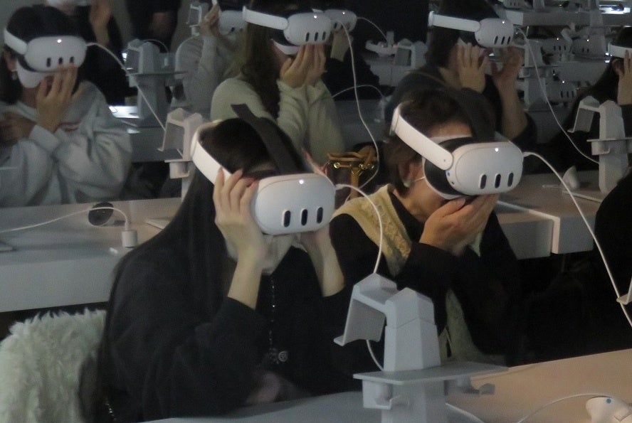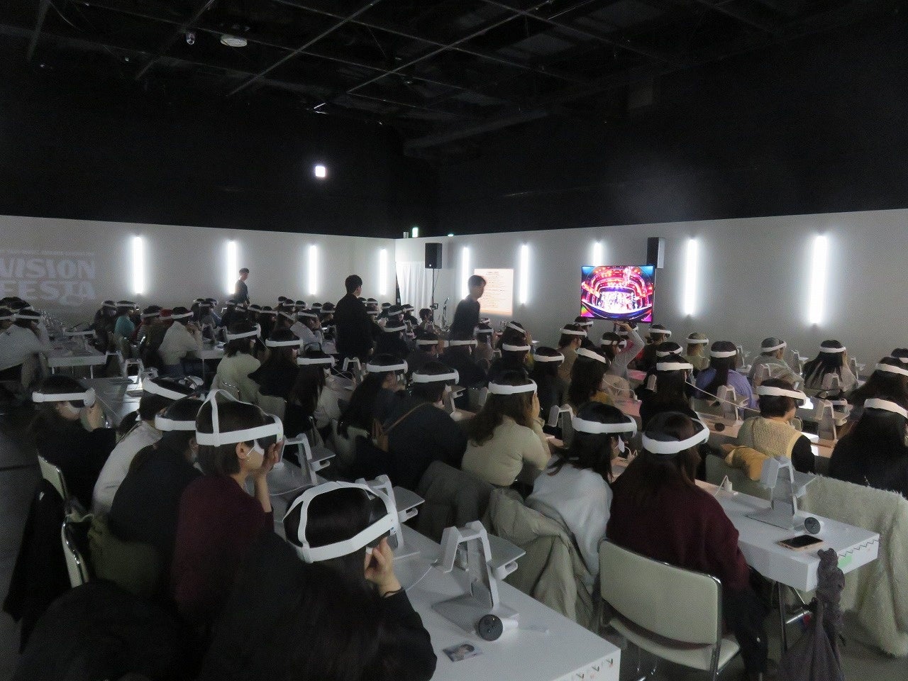 VR SHOWでは、コンサートのステージが目前に広がる圧倒的没入体験を実現。まるでアーティストが手を伸ばせば届く距離にいるかのような異次元の臨場感が、あなたを特別なステージ空間へと誘います。ゴーグルを着けた観客たちは、目の前にいるアーティストたちのあまりの近さに、歓声はもちろんのこと、絶叫の嵐。手拍子をしたり、一緒に手の振り付けをしたりと、360°アーティストを独り占めしたような空間の中、ライブステージを楽しんでいました。
