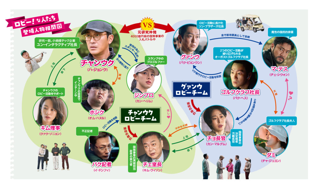この度解禁するキャラクター紹介動画「ロビー!な人たちをおさらいしよう」では、主人公チャンウクのほか、ライバル会社社長のグァンウ(パク・ビョンウン)、チャンウクの接待相手であるチェ室長(キム・ウィソン)、グァンウ側の接待相手チョ長官(カン・マルグム)、チャンウクの頼れる部下キム理事(クァク・ソニョン)、情報を握るパク記者(イ・ドンフィ)、チェ室長の推しゴルファーのジン・セビン プロ(カン・ヘリム)、魔性の国民的俳優マ・テス(チェ・シウォン)、ゴルフ場社長の妻ダミ(チャ・ジュヨン)、ゴルフ場社長(パク・ヘス)という主要キャラクター10人を紹介。登場人物それぞれの背景や思惑を本動画でチェックして、彼らが映画本編ではどのように絡み合っていくのか、ぜひ確認して欲しい。