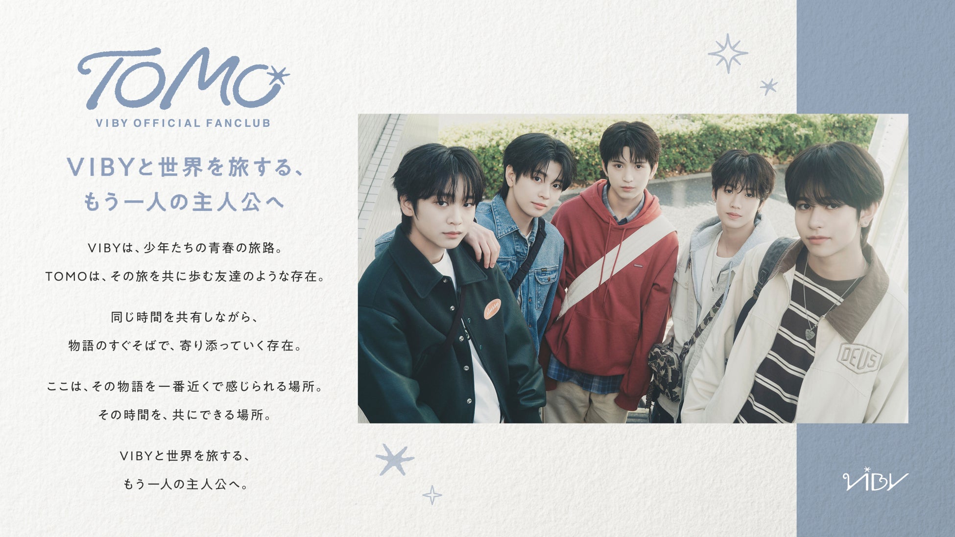 「TOMO」は、VIBYのファンネームでもあり、アーティストとファンが同じ時間を共有しながら歩んでいく「仲間」「友達」という意味が込められています。VIBYが掲げる「輝く青春の旅路」というコンセプトのもと、その旅を最も近い距離で共に歩むコミュニティとして誕生しました。