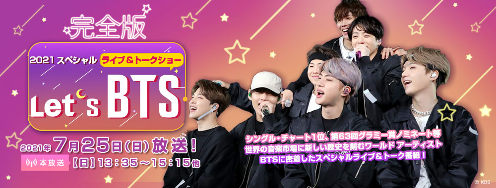 このたび、KBS JAPAN 株式会社が運営する韓流専門総合エンターテインメントチャンネル KBS World では 「 Let’s BTS 2021 スペシャルライブ&トークショー 【 完全 版 】 」 を 7 月 25 日 (日 ) 13:35 ~他 放送いたします。 2021 年 6 月に前後編でお届けした内容を今回は一挙放送 いたします。