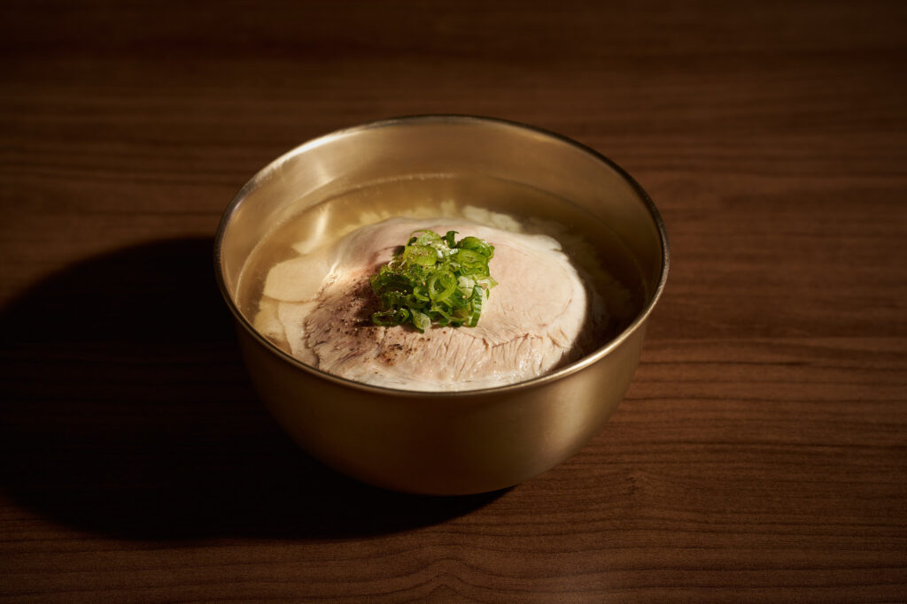 韓国の伝統的なスープであるコムタンは、⽜⾁、⾻、内臓をじっくり煮込んだものが⼀般的。豚⾁のスープは「クッパプ」と呼ばれ、しっかりとした味とのバランスをとるために唐⾟⼦ソースがよく使われています。⼀⽅オクドンシクでは、豚ウデ⾁と⾹⾟野菜をじっくり煮込んだ独特のすっきりとしたスープが特徴。スープの味付けは塩のみで、デリケートな豚⾁の⾵味を引き⽴て、⼀般的に⾻や内臓の部分を含む重いクッパとは⼀線を画します。薄くスライスされた無塩豚⾁がご飯の上にのせられ、⾷べる直前に 75〜80℃の最適な温度に保たれた熱いスープに静かに浸した状態で提供されます。