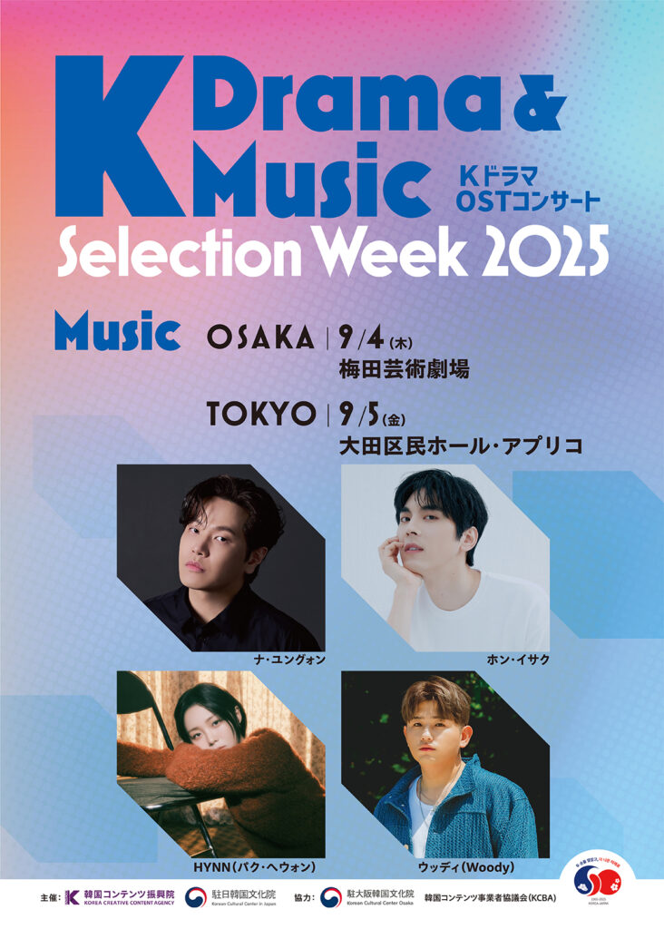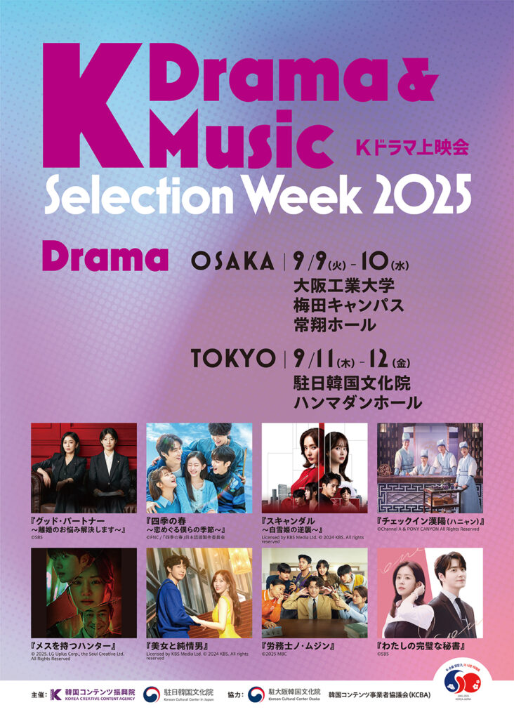 韓国コンテンツ振興院(KOCCA)と駐日韓国大使館 韓国文化院は、今年、日韓国交正常化 60 周年を迎える節目の年を迎えたことを記念して、K カルチャーの多彩な魅力を伝えるイベント『K Drama & Music Selection Week 2025』を 9 月 4 日(木)~12 日(金)に東京と大阪の 2 都市で開催します。