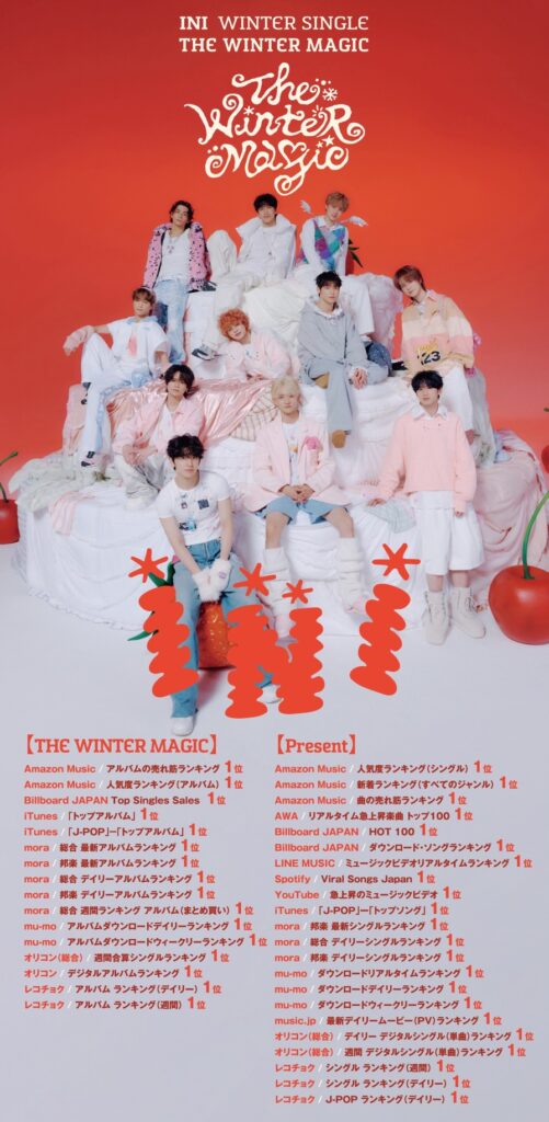 グローバルボーイズグループINIが11月19日(水)にリリースした WINTER SINGLE『THE WINTER MAGIC』が1週間で121万枚を売り上げ、国内における今年度最高のシングル初週実績および自己最高記録を更新。「Billboard JAPAN Top Singles Sales」「Billboard JAPAN Hot 100」(2025年11月26日公開)や「オリコン週間シングルランキング(2025年12月1日付)などで堂々の1位を獲得したほか、楽曲ダウンロードやラジオなど各種音楽チャートでも続々と1位を獲得しています。