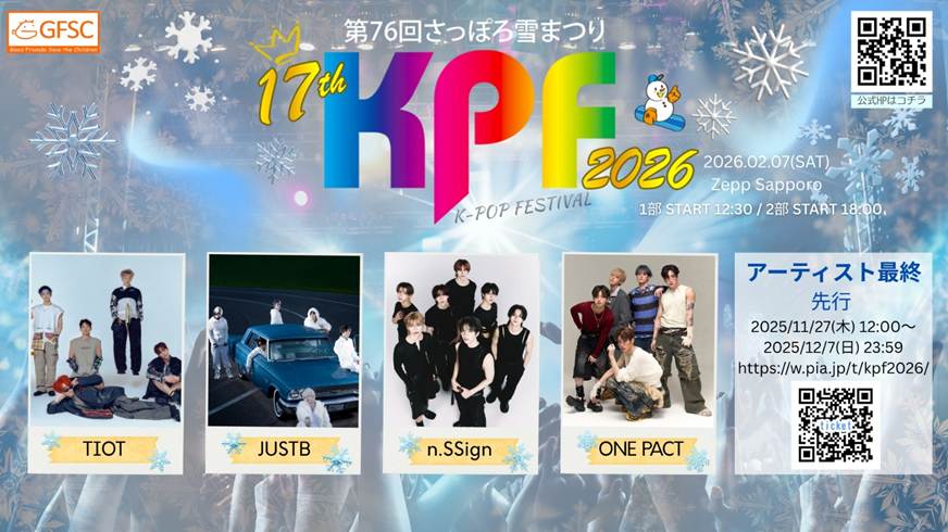 毎冬、音楽とGFSC(Good Friends Save the Children)チャリティーを通じ、子供たちに夢と希望を届けるGood Concertとして知られる、さっぽろ雪まつり公式協賛行事「第76回さっぽろ雪まつり17th KPF2026」で待望の札幌初上陸を果たすJUSTBとONE PACTがGFSC公式広報大使に任命され、ファンにむけメッセージ映像を公開した。未来に向かう子供たちに、輝く笑顔を届ける希望のメッセンジャーとしての期待感で、彼らの瞳はキラキラと光を放っている。