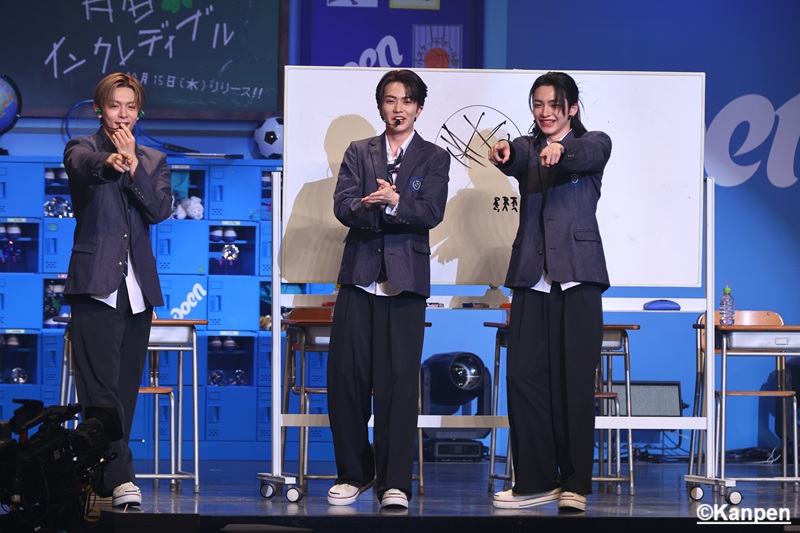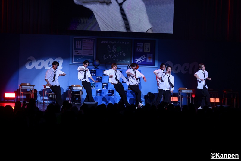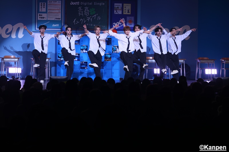 始業のチャイムが鳴り、制服姿のaoenメンバーが教室へ。 Digital Single『青春インクレディブル』タイトル曲「青春インクレディブル」を元気いっぱいに披露した。 aoenのダンスは いつ見てもキレがよく、そして見事に揃っている。見ていて爽快な気分になることができる最高のパフォーマンスで「aoen高校」の一日は始まった。
