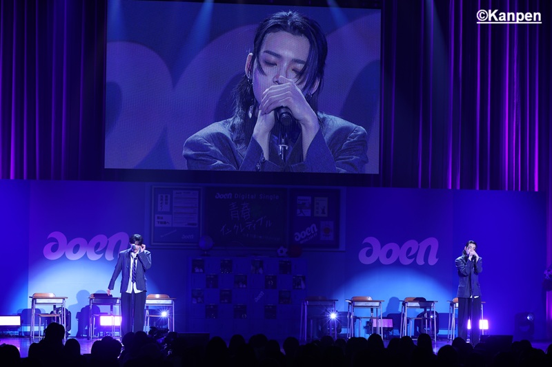 続いて優樹(YUJU)と颯太(SOTA)が 米津玄師の「感電」を披露した。 今までのaoenのイメージとは違う雰囲気でaoenメンバーの持つ新しい魅力を知らせた。難易度がかなり高く、歌いきるには相当なボーカルスキルが必要な楽曲だが、二人の確実な歌唱力で楽曲の描く世界観をしっかりと感じさせてくれた。歌い終わるとaoringからは大きな拍手が起こった。颯太(SOTA)による選曲だそうだ。