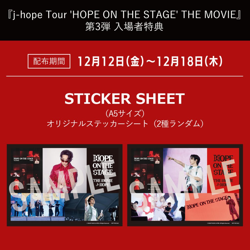 11月28日(金)から全国公開中の、J-HOPE初の単独ワールドツアーのフィナーレを記録したライブドキュメンタリー映画『j-hope Tour ‘HOPE ON THE STAGE’ THE MOVIE』について、12月12日(金)より配布される入場者特典第3弾が決定した。入場者特典第3弾は、「オリジナルステッカーシート(2種ランダム)」であり、本編から切り取ったJ-HOPEのライブパフォーマンスやポスタービジュアル、ロゴを1枚にまとめた仕様となっている。無くなり次第配布終了となるため、ぜひ劇場で手に入れていただきたい。
