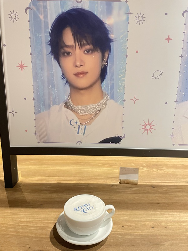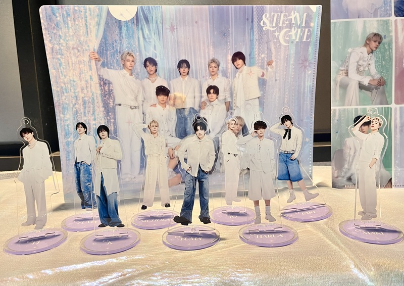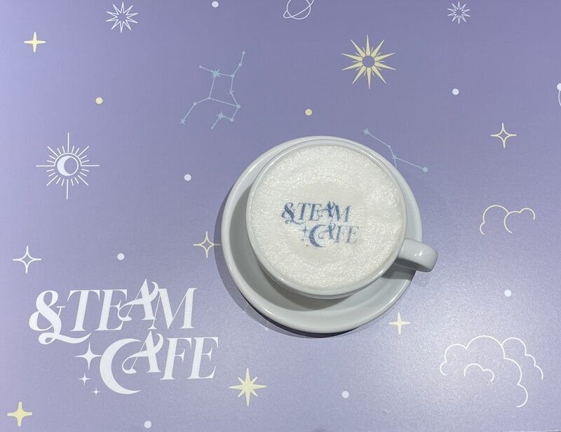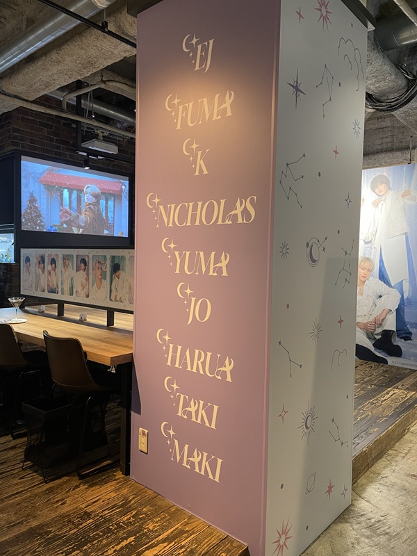 &TEAM CAFEはこれまでも様々なテーマで&TEAMの世界を楽しめる空間として開催されてきており、今回は&TEAM CAFE~Dawn’s Constellations~と題して冬にピッタリの月と星座をモチーフにした空間が繰り広げられている。入った瞬間から&TEAM CAFEのコンセプトで撮影された9人の集合ショットが早速お出迎え。
