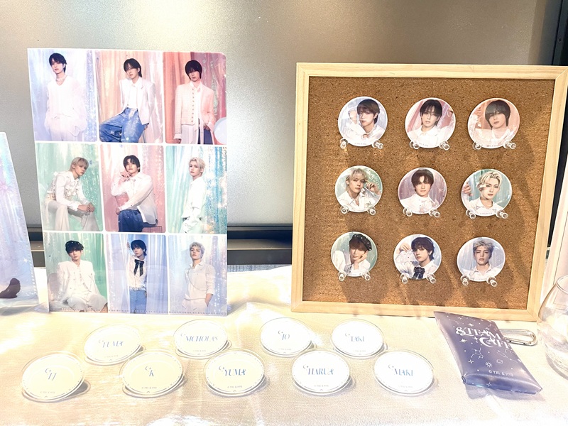 キラキラの白衣装をまとったビジュアルのアクリルスタンドキーホルダーやアクリルバッジはもちろん、コンセプトを表現したグラスやメンバーの手書きイラストがデザインされたアクリルチャームといったオリジナルアイテムはここでしか手に入らない限定品だ。