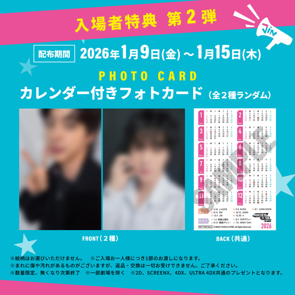 先週末の公開からARMY(BTSファンの呼称)から大きな反響を呼び、話題となっている本作より、待望の入場者特典第2弾の詳細が公開された。第2弾は「カレンダー付きフォトカード(全2種ランダム)」で、表面にはJINの輝かしい姿を収めたセルフィ―写真を採用。黒の衣装を身にまとい、洗練されたクールな魅力を放つカットと、ハートポーズをする愛らしいカットという、対照的な2種のビジュアルが用意されている。裏面は、2026年の年間カレンダー仕様となっており、BTSのデビュー記念日や各メンバーの誕生日がマークされ、ARMYにとってかけがえのないアニバーサリーデザインに仕上がっている。特別な特典をぜひ劇場で手に取ってほしい。
