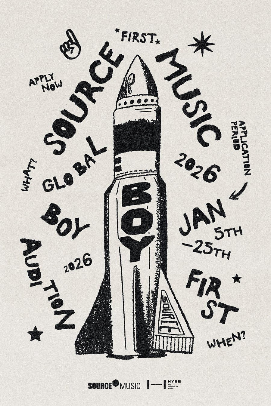 LE SSERAFIM所属のSOURCE MUSICが初となるボーイグループを結成します。本日1月5日より、2008年以降生まれの男性を対象とした「SOURCE MUSIC 2026 GLOBAL BOY AUDITION」をオンラインにて世界同時開催します。