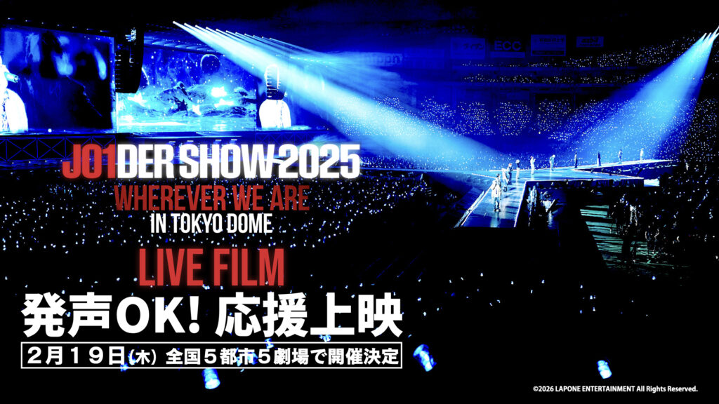 現在全国公開中の、グローバルボーイズグループJO1初のライブ映画作品『JO1DER SHOW 2025 ʻWHEREVER WE AREʼ IN TOKYO DOME – LIVE FILM』において、【副⾳声付き上映】および【発声OK︕応援上映】の実施が決定いたしました。