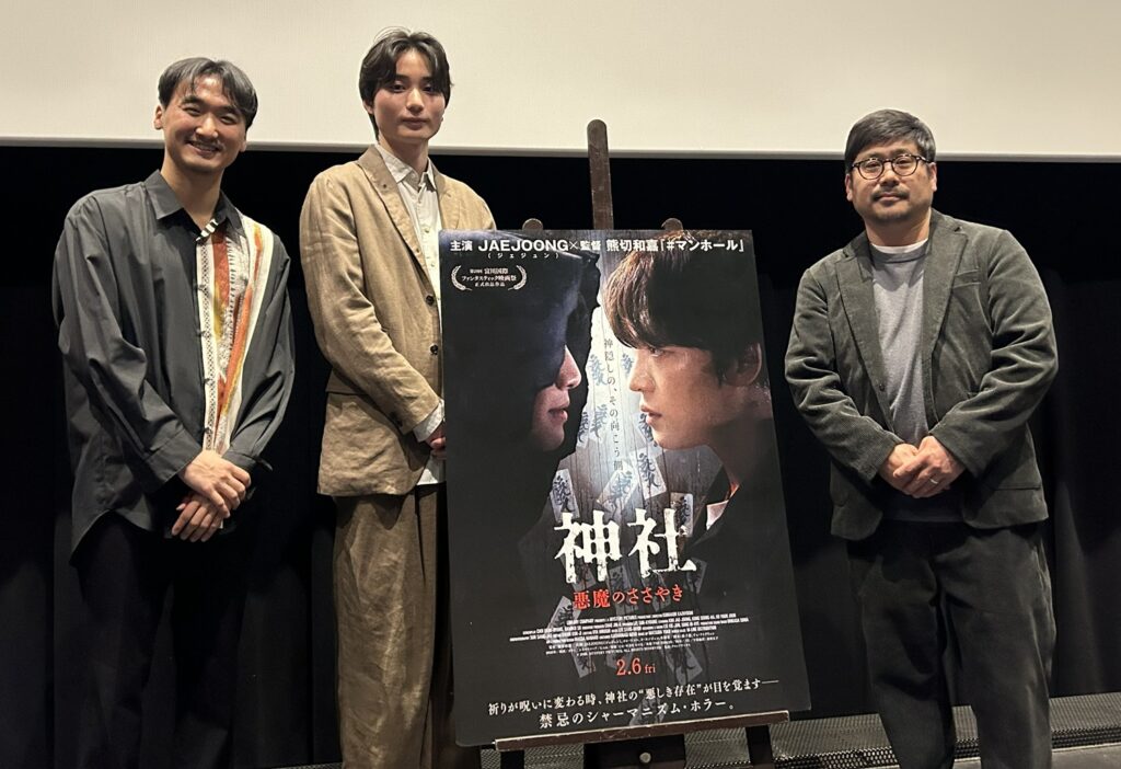 JAEJOONG(ジェジュン)主演×熊切和嘉監督の新作ホラー『神社 悪魔のささやき』が絶賛公開中(配給:クロックワークス)。2/6(金)に実施した熊切和嘉監督、畑中惟吹、オ ヨンジュン登壇の公開記念舞台挨拶付き上映オフィシャルレポートをお送りいたします。本作は神戸の廃神社で大学生たちが次々と“神隠し”のように失踪する事件をきっかけに、韓国からやって来た祈祷師ミョンジンが調査に乗り出し、“悪しき存在”の正体に迫っていくシャーマニズム・ホラー。生まれながらに祈祷師となる宿命を負いながら、消えない過去の影に囚われる主人公ミョンジンを演じ、キャリア初のホラーに挑むのは、アジアを代表するアーティスト・俳優のJAEJOONG(ジェジュン)。神と悪魔の狭間に立つダークヒーロー像を圧倒的な存在感で体現している。そしてメガホンを取るのは、『658km、陽子の旅』で第25回上海国際映画祭 最優秀作品賞・最優秀女優賞・最優秀脚本賞の三冠を受賞し、『#マンホール』では第73回ベルリン国際映画祭、第27回富川国際ファンタスティック映画祭に正式招待されるなど、国内外で高い評価を獲得し続ける熊切和嘉監督。これまで人間の本質や極限状態における感情の機微を鋭利に描いてきた熊切監督が、ミステリージャンル専門の製作会社ミステリー・ピクチャーズとタッグを組み、本作ならではのダークな恐怖表現を完成させた。本作は第28回富川国際ファンタスティック映画祭「マッドマックス」部門にも出品され、オール神戸ロケという点でも大きな話題を呼んだ。共演にはコン・ソンハ、コ・ユンジュン、木野花らが名を連ね、作品世界に確かな厚みを与えている。韓国のシャーマニズム的視点と、日本の風土と文化が交差する、新感覚のホラーが誕生した。