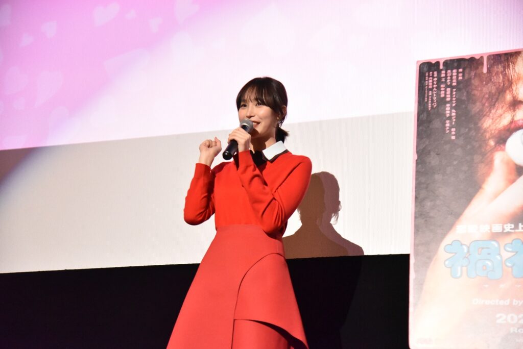 また、南は、ゆりやん監督の現場について「毎朝、撮影に入る前に朝礼みたいなことをして、全員でコール&レスポンスをするんです」というエピソードを披露すると、ゆりやん監督自ら、もはやイベント恒例となっているコール&レスポンスを実演!「禍禍女!」「大ヒットするぞ!」「大ヒットさせろ!」「アカデミー賞獲るぞ!」「アカデミー賞獲らせろ!」「興行収入」「5000億!」と力強く客席と一体となってコール&レスポンスを行ない、最後に「100人乗っても」「大丈夫!」と締め、会場は爆笑に包まれた。