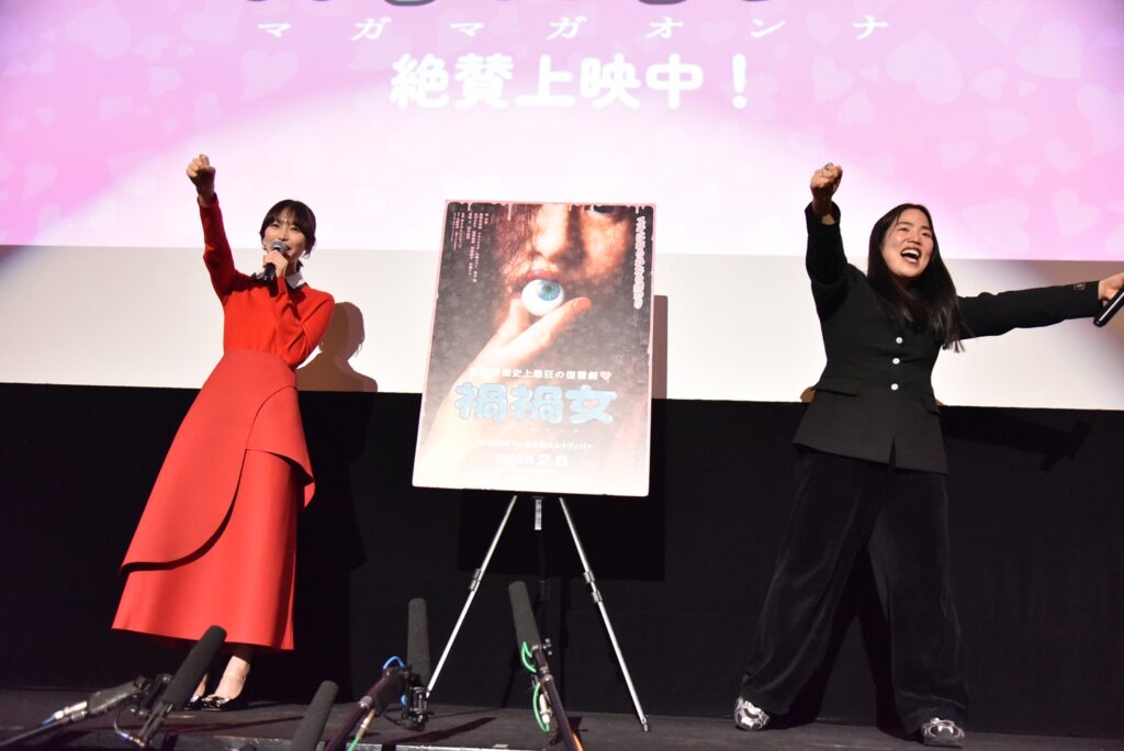 舞台挨拶の最後に、ゆりやん監督と南さんは、観客を巻き込んでもう一度、コール&レスポンス!「禍禍女」「Filmarks(フィルマークス)!」「5.0!」と口コミサイトでの高評価へと誘導する巧みな煽りっぷりで、笑いの中で舞台挨拶は幕を閉じた。